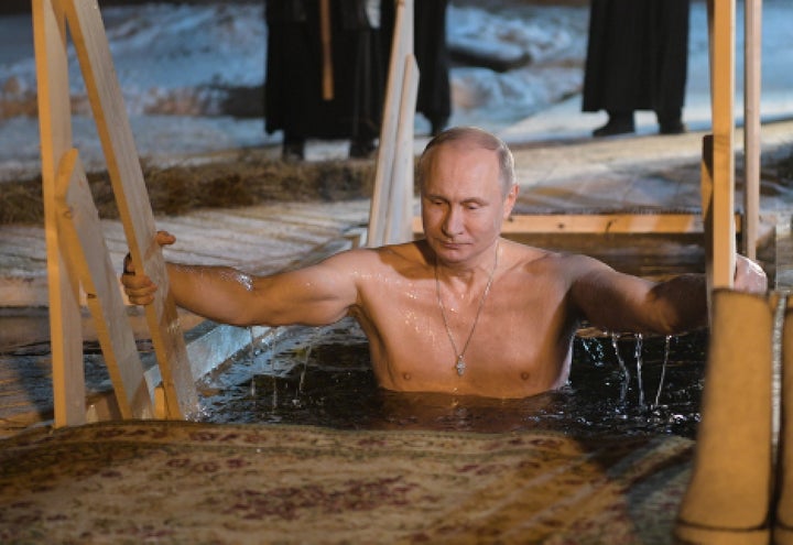 For the month of January, you can enjoy a bare-chested Putin taking an ice-cold dip as part of the Russian Orthodox Church’s traditional celebration of Epiphany:
