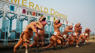 AUBURN, Wash. (AP) — A track for live horse racing in suburban Seattle turned prehistoric over the weekend as more than 200 people ran down the track cloaked in inflatable Tyrannosaurus rex dinosaur costumes.