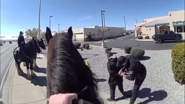 One of the officers dismounts from his horse and handcuffs the man, who has been charged with stealing $230 worth of merchandise from the Walgreens, according to the Albuquerque Police Department.